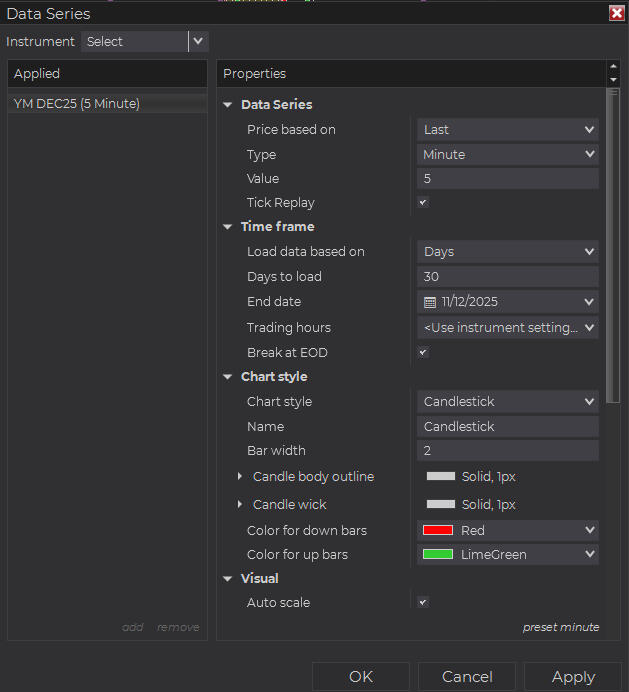 Important note: OmniScan requires Tick Replay to be enabled in your NinjaTrader 8 chart in order to access and display complete volume-related data.