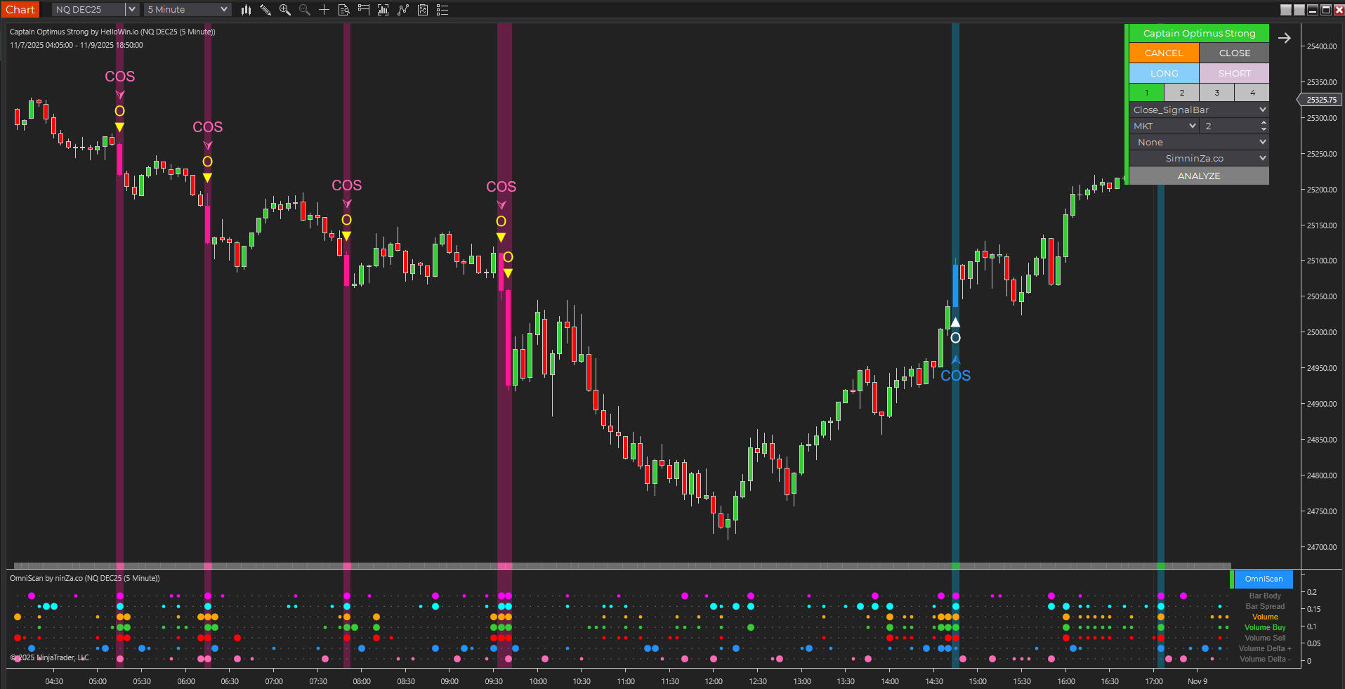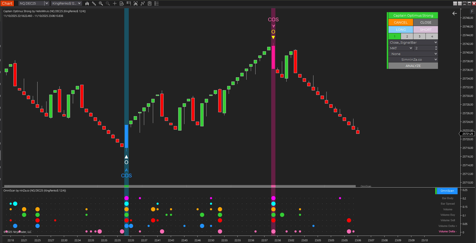 When OmniScan meets Captain Optimus Strong, traders unlock a complete cycle of market intelligence – from deep analysis to full automation.• OmniScan acts as your market microscope – identifying the most extreme, meaningful candles in real time: speed, volume, delta, volatility, and momentum.• Captain Optimus Strong serves as your strategy commander – combining signals from OmniScan and other indicators to generate, execute, and backtest trades automatically.Together, they form a professional-grade workflow that bridges price discovery and trade execution.