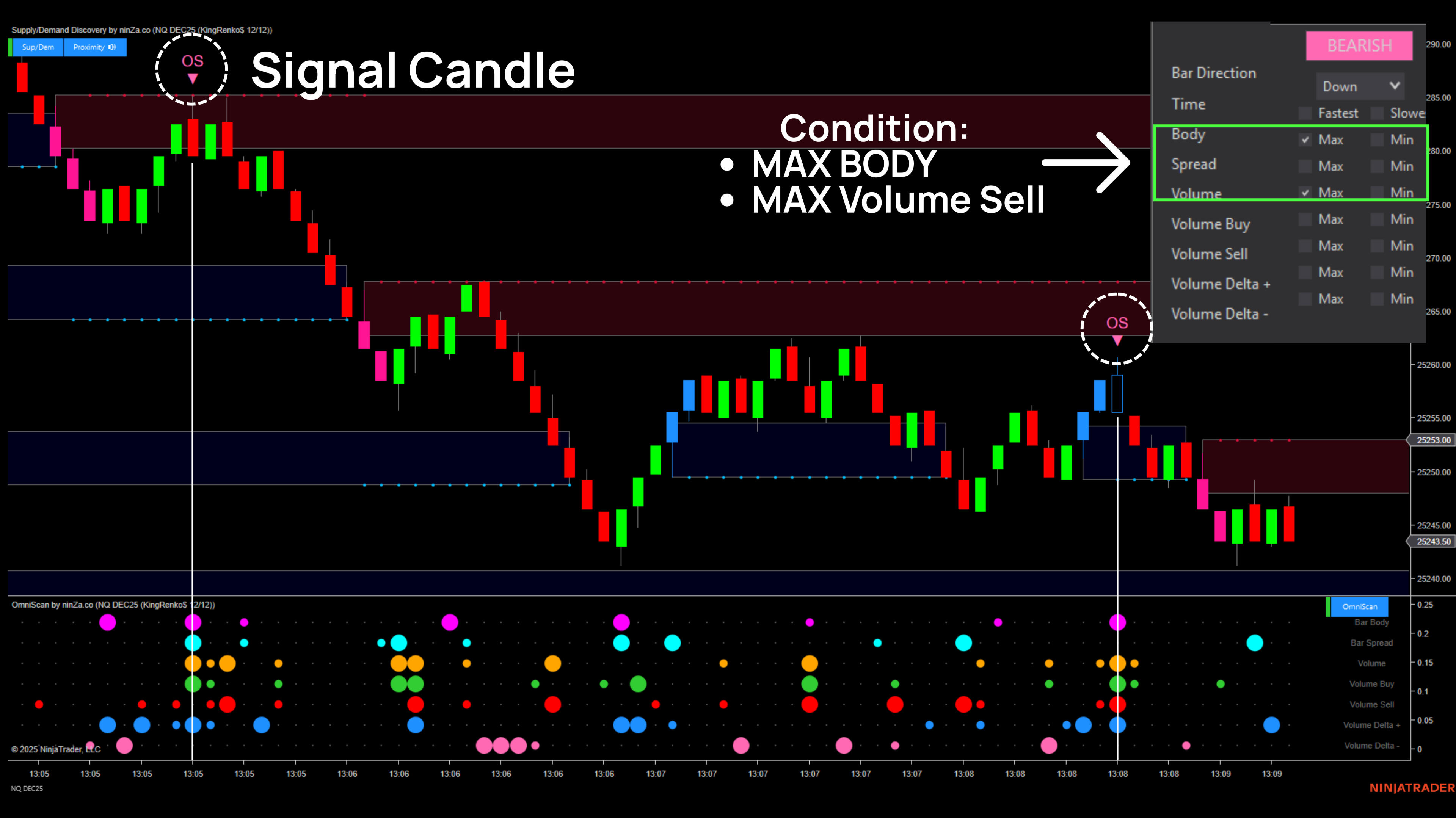 Simply choose how many candles to analyze (N), and OmniScan scans through that cycle to find extreme information points (Max/Min) – then marks them visually on your chart.You’ll instantly see which candles dominate in speed, size, volume, and delta, 16 total extreme data points revealing where real market energy flows.
